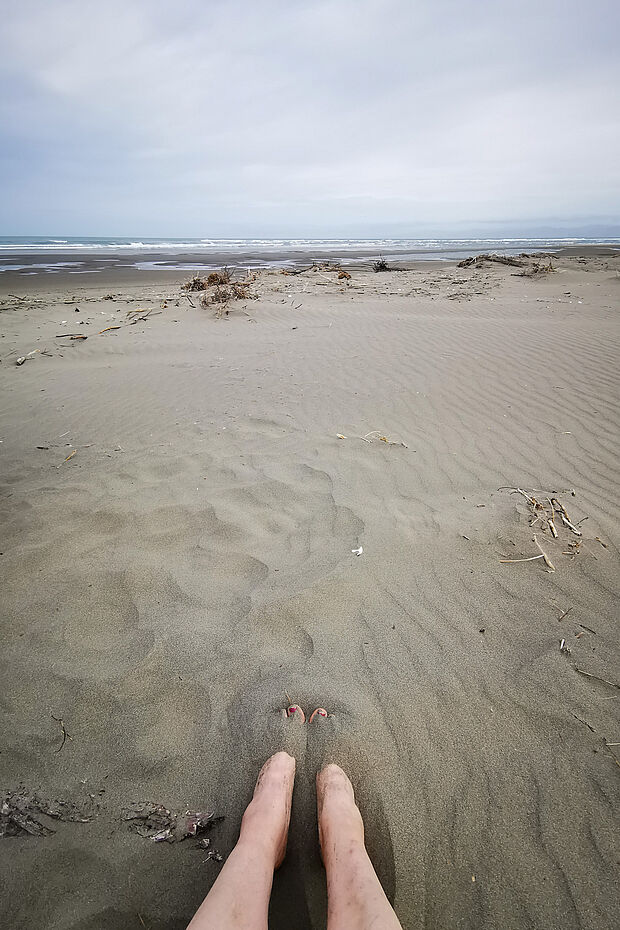 Da schönes Wetter ist, nutzen wir den letzten Nachmittag am Meer noch für ein Bad im Pazifik. Aber man muss eine ganz schönen Weg bis zum Strand zurücklegen, weil es durch den Wald wegen des Gestrüpps einfach nicht geht.