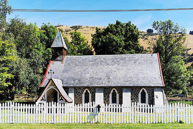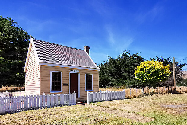 Nach dem Frühstück geht es dann los. Das Museum in Okains macht erst am Donnerstag wieder auf, aber wir können ein paar schöne alte Gebäude auch von der Straße her betrachten.