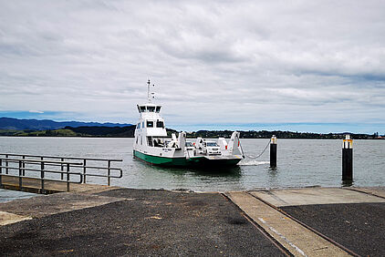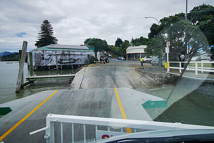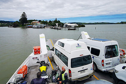 Wenn wir schon mal am Strand schlafen, müssen wir auch nochmal ins Wasser oder Muscheln sammeln. Dann geht es gegen halb zehn auf die Strecke. Da die Hauptstraße gesperrt ist, geht es durchs Gebirge. Die Strecke ist kurvenreich und wunderschön. Über den Hokiaga Harbour setzen wir mit der Fähre über, dann sind es nur noch 25 km bis zu Neuseelands größtem Kauri-Wald.