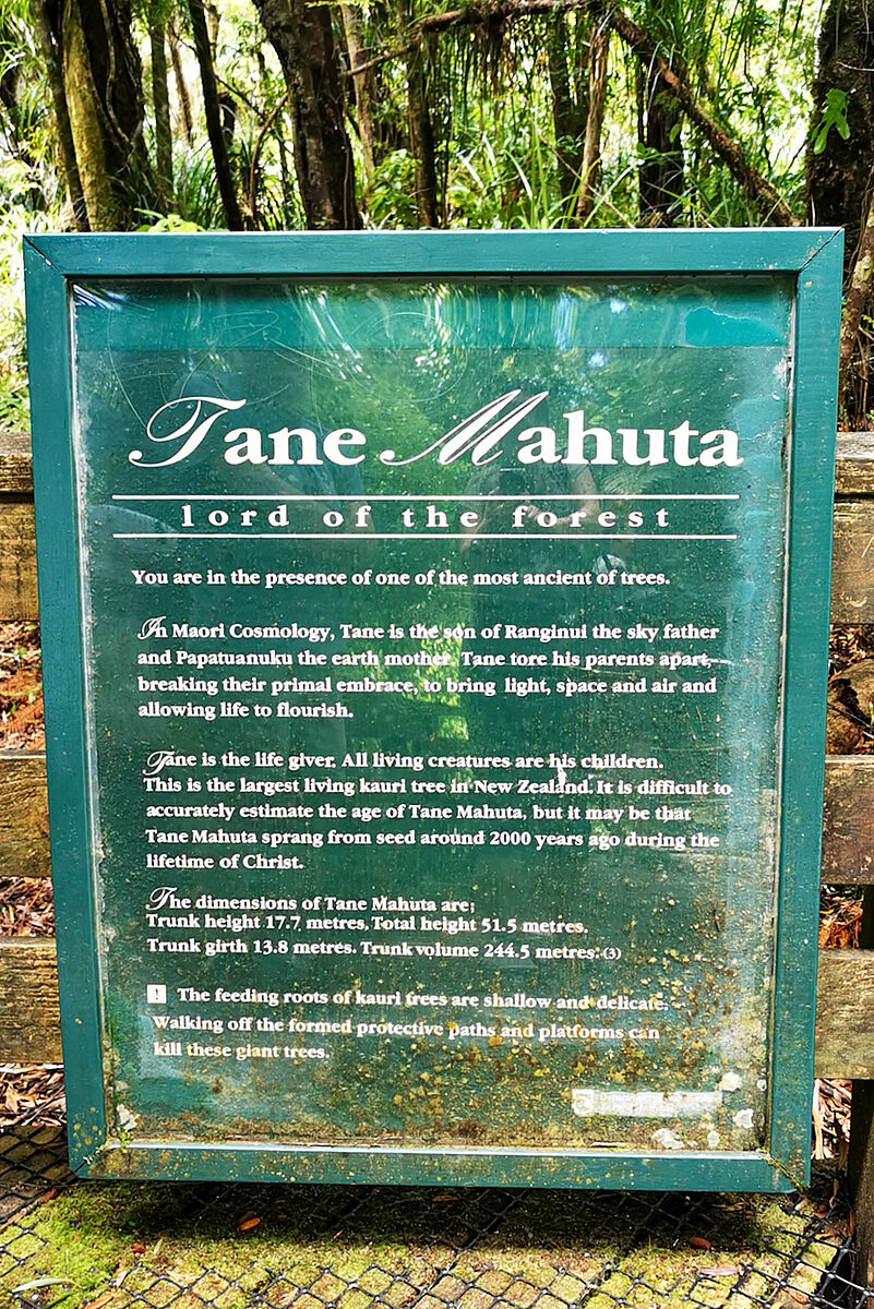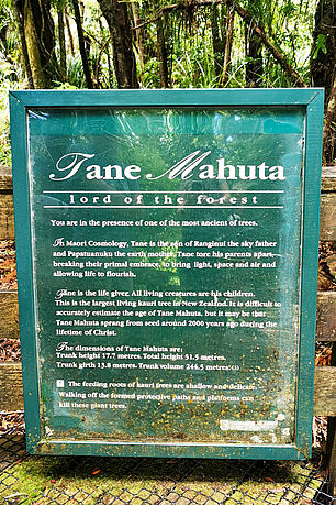 Highlight ist Tane Mahuta. Der „Gebieter des Waldes“ ist Neuseelands größter lebender Kauri. Er ist 51,20 Meter hoch und hat einen Umfang von 13,77 Metern. Über 1000 Jahre alt ist dieser berühmteste Baum Neuseelands. Der Maori-Legende nach ist Tane der Sohn von Ranginui, dem Himmelsvater, und der Himmelsmutter Papatuanuku.