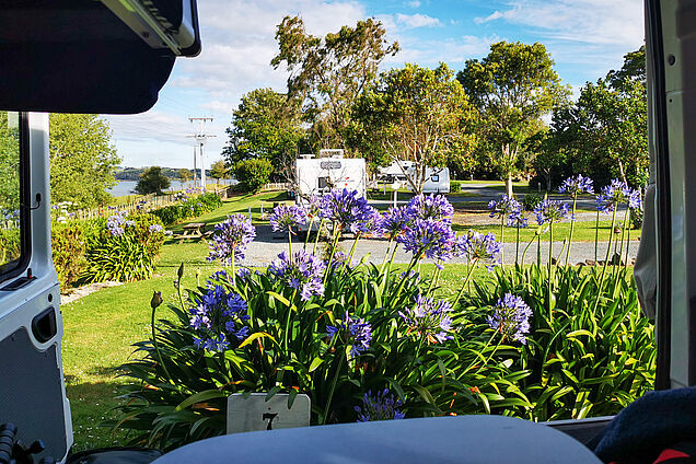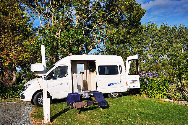 Wir halten in und haben einen schönen Stellplatz in einem Camp in Matakohe in der Nähe des Kauri-Museums.