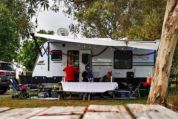 Als wir auf dem Campingplatz ankommen, feiert eine neuseeländische Familie neben uns im Camper schon Weihnachten.