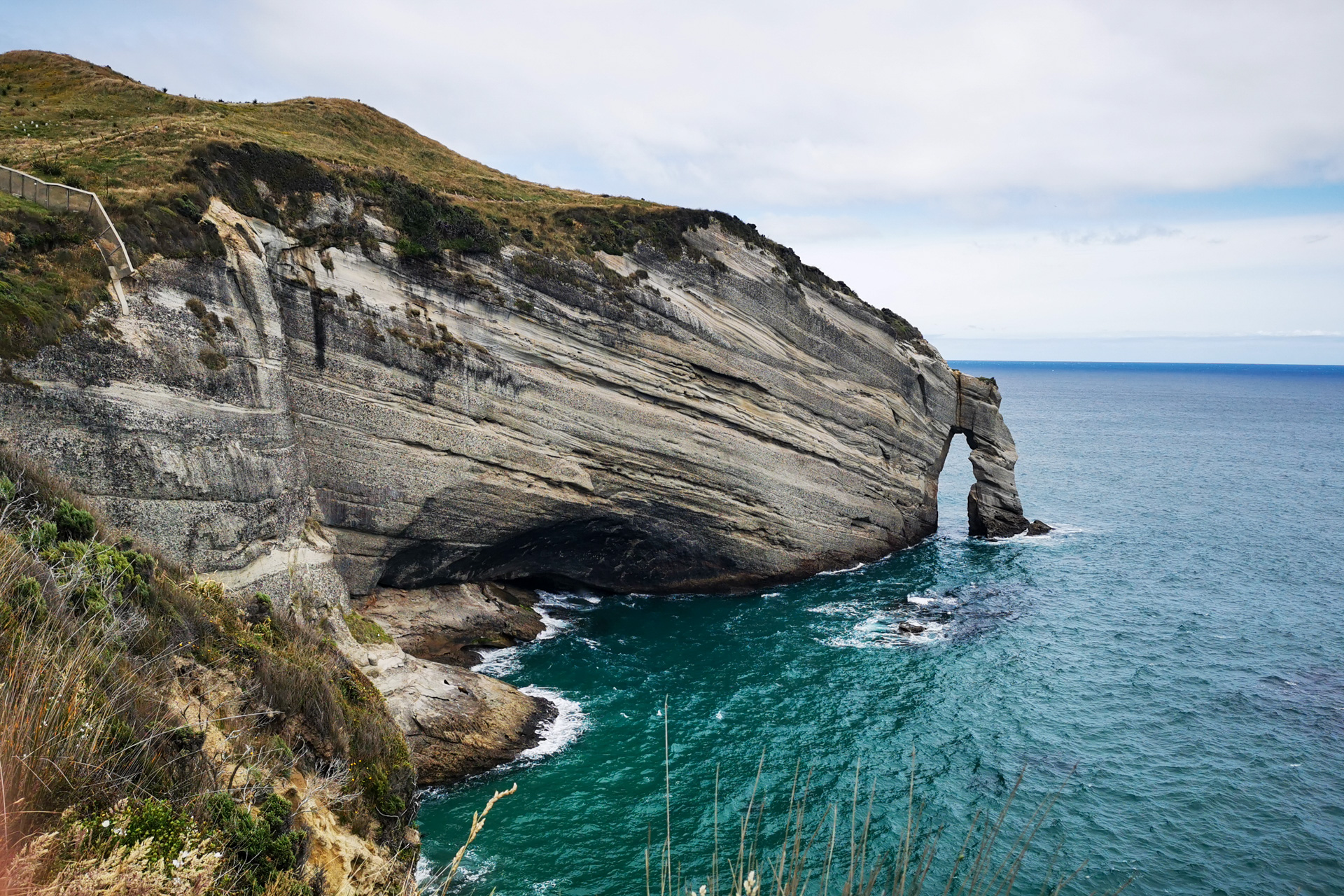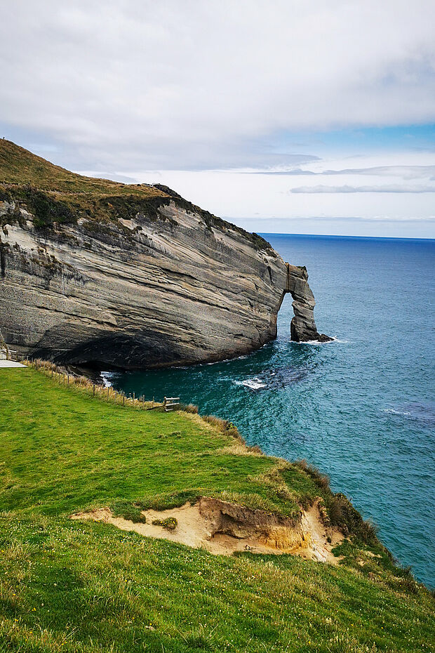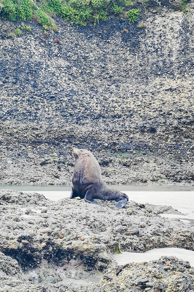 Auf dem nördlichsten Punkt der Südinsel ragt der Leuchtturm Pillar Point über der Steilküste. Zwei Wanderwege zum Turm sind ausgeschildert, aber wir gehen vom bekannten Steinbogen nur bis zum ersten Hügel. Die Fotoapparate klicken und wir beobachten faule Seehunde und nach Fischen jagende Robben.