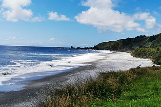 Dann geht es sie Westküste entlang nach Süden. Wir sind fasziniert. Auf der einen Seite das tosende Meer, auf der anderen Seite Urwald mit Palmen,