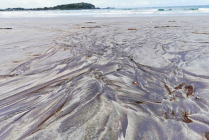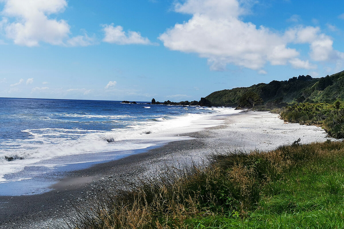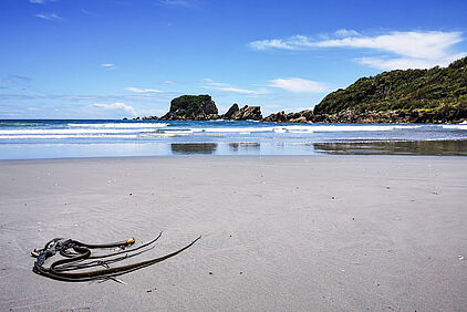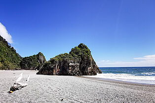 Hier erwartet uns ein schöner Sandstrand, an dem wir einen Vorgeschmack von der rauchen Westküste erhalten, die wir heute noch entlang fahren werden.