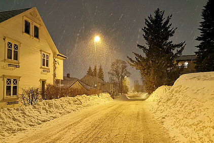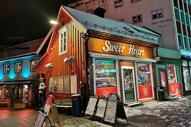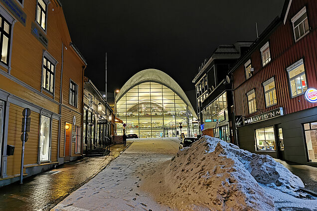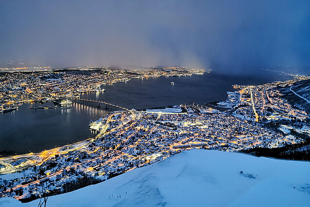 Der Storsteinen ist der Hausberg von Tromsø. Von dem 421 m hohen Berg hat man die beste Aussicht auf die Stadt und die Insel Tromsøya und die Insel Kvaløya, die mit Brücken verbunden sind. Die Aussichtsplattform erreicht man zu Fuß oder mit der Seilbahn Fjellheisen. Zur deren Talstation gelangt man entweder mit dem Bus der Linien 26 (oder 28) oder in einem 30-minütigen Spaziergang vom Zentrum aus. Die Seilbahn fährt selbst im Winter bis 23:00 Uhr jede halbe Stunde. In knapp fünf Minuten gondelt man ganz gemütlich in die Höhe. |