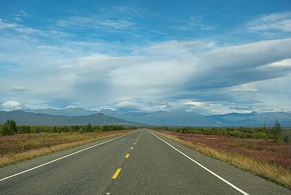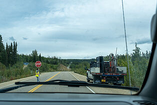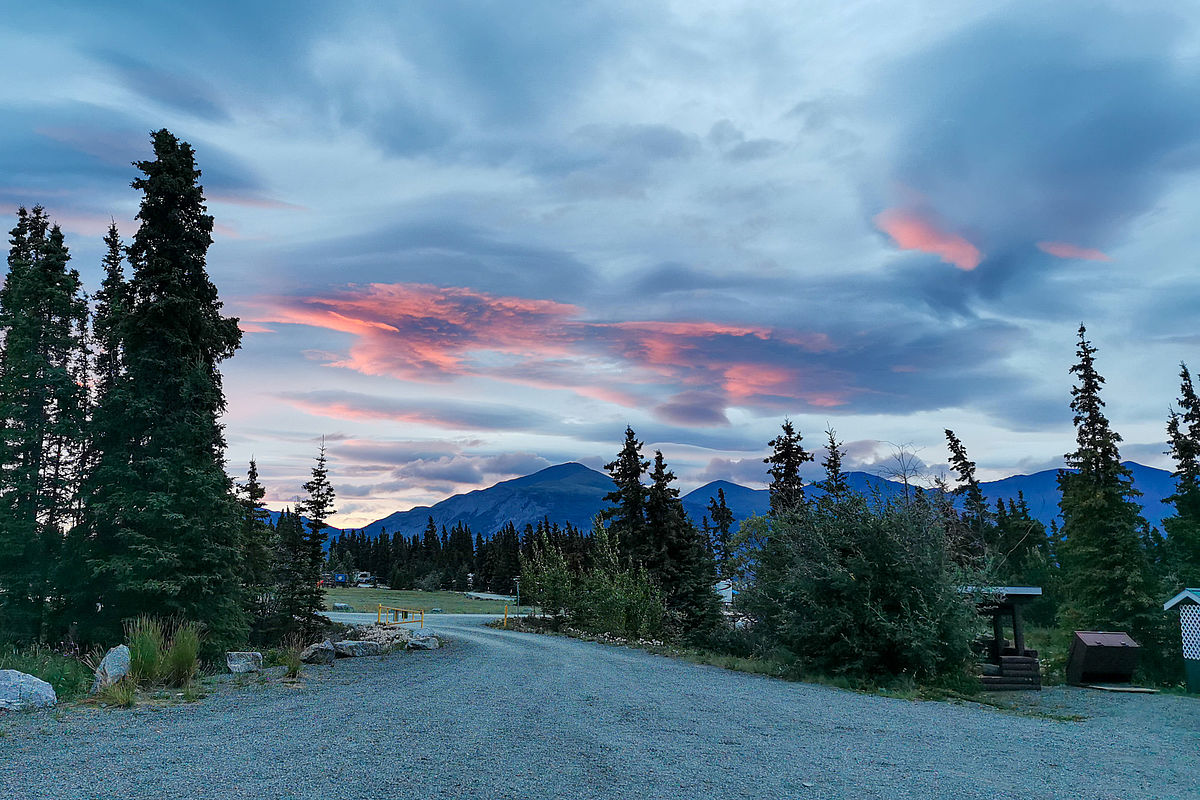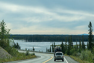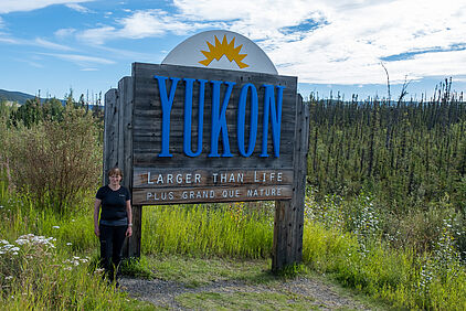 Nun ist es nicht mehr weit zur Grenze. Nach nur einem Tag Alaska geht es heute wieder zurück nach Kanada. Wir halten noch einmal kurz am Yukon-Schild und passieren dann ohne viel Aufenthalt die Grenzkontrolle. Mit einigen Fotostopps rollen wir nun zu unserem Ziel, dem Kluane-Nationalpark.