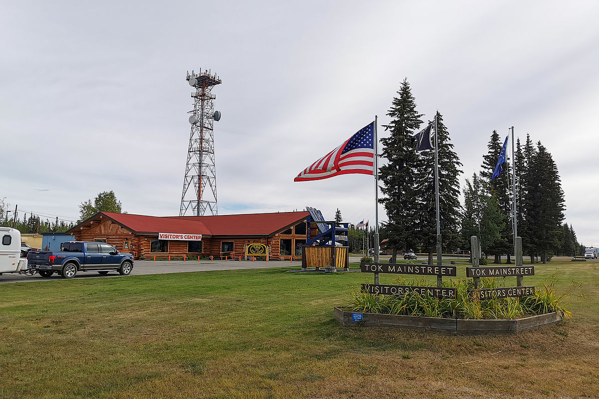 Da noch Einkäufe zu erledigen sind, warten wir eine Weile am schönen Tok-Infocenter. Ich nutze die Zeit, mal zu Hause anzurufen. Um 11 Uhr fahren wir dann los.