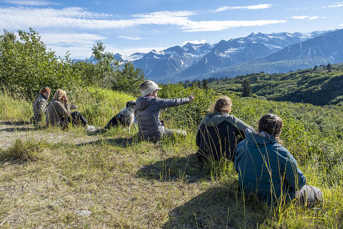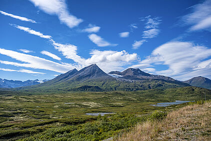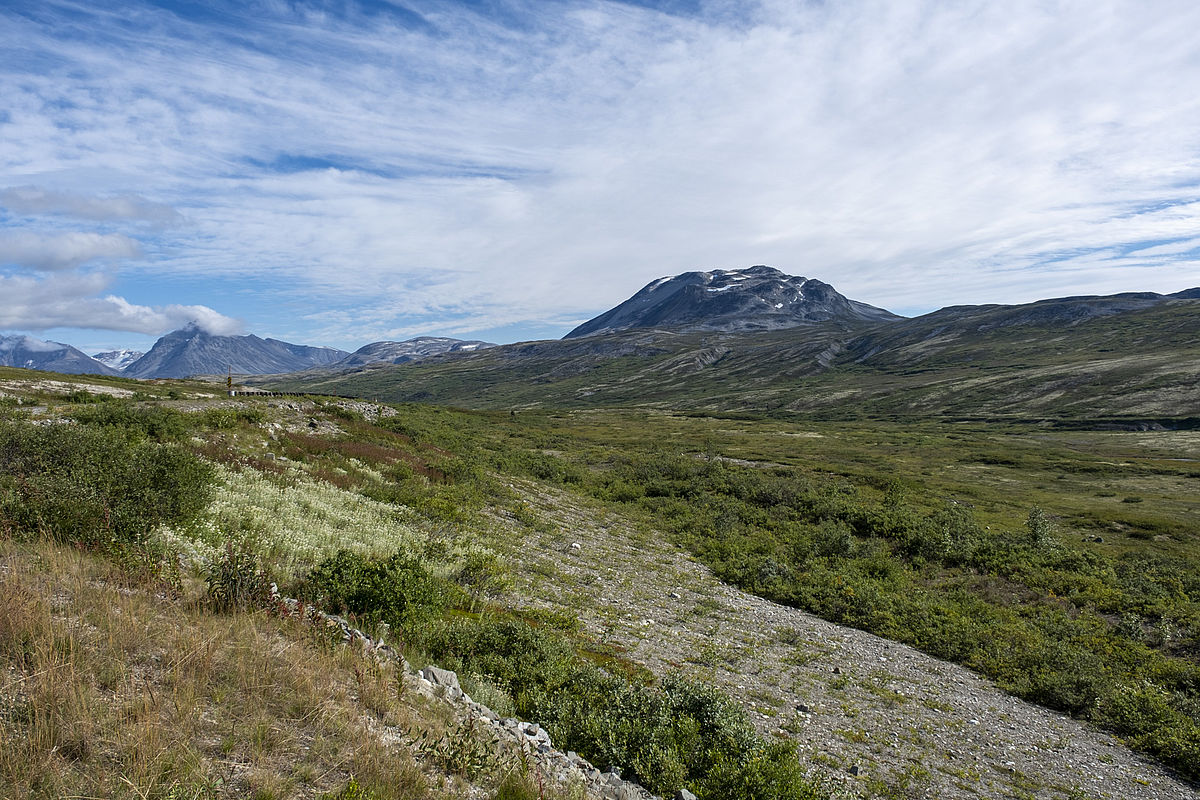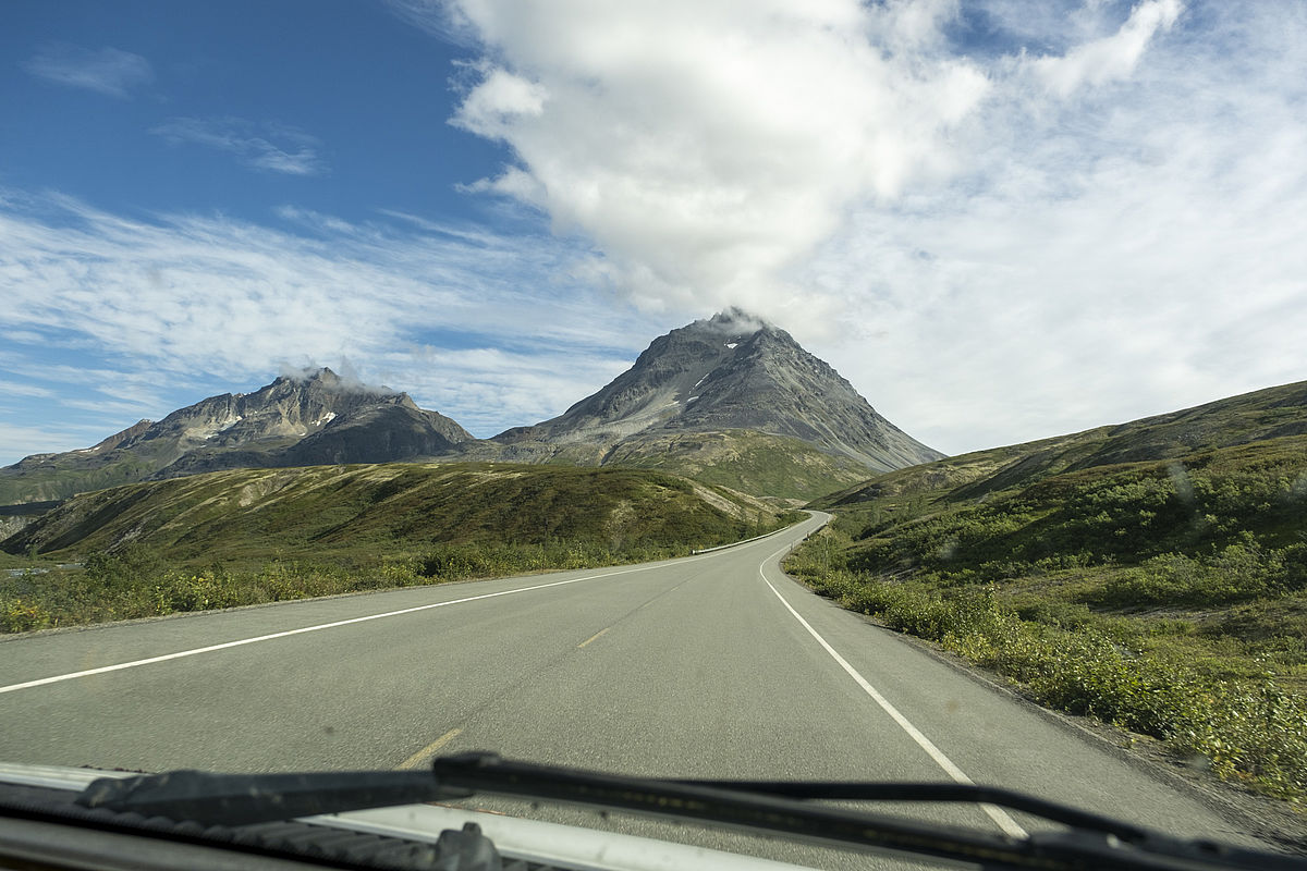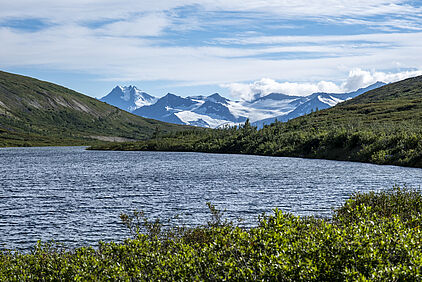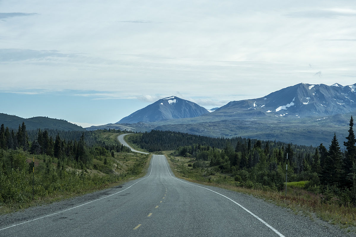 Wir fahren durch eine wunderbare Landschaft und halten am Three Guardsmann Lake für Fotos. Hinter dem Glave Peak schauen schon die Gletscher des Jarvis Peak hervor. Ein paar Kilometer weiter halten wir dann auf einem Parkplatz und verspeisen unser Dinner mit Blick auf die schneebedeckten Berge des Kluane NP. Ich flitze nochmal auf einen Hügel auf der anderen Straßenseite und schaue zurück auf die Three Guardsman