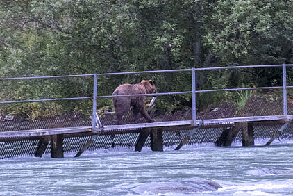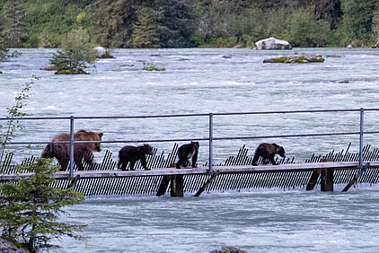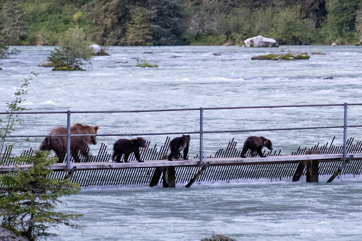 Wir fahren weiter entlang des Lutak Inlet in Richtung Nordwesten. An einer Lachstreppe können wir dann noch eine Bärenfamilie beobachten. Hier ist eine Grizzly-Mutter mit ihren drei Jungen unterwegs und fängt Lachse zum Abendbrot. Wunderbar und niedlich !!!
