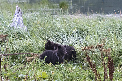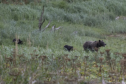 Die Bärin und ihre Jungen sind schon da. Allerdings auch viele Fotografen, die teilweise dicht an die Tiere ran gehen. Wir finden das nicht gut und wechseln nochmal den Platz. Wir haben Glück und die Tiere nähern sich in unsere Richtung. Wir filmen und machen Fotos. Die kleinen Bärenkinder sind so drollig, wie man sie sich vorstellt.