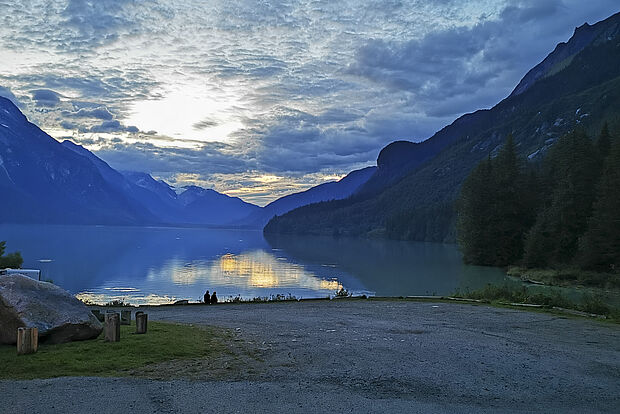 Dann fahren wir noch zum Chilikoot-Lake, wo wir noch ein paar Abendstimmung-Fotos schießen. Am Ufer steht eine Tisch-Garnitur. Hier wollen wir mal frühstücken!