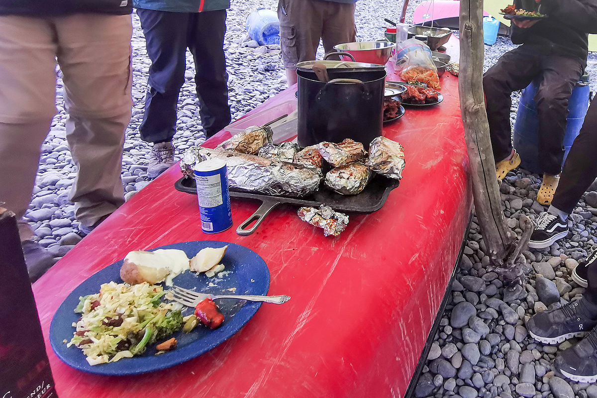 Ein umgedrehtes Boot ist unser Tisch. Es gibt Spareribs, Kartoffeln, Broccoli, Salat, Knoblauchbrot, und und und ... Ich weiß nicht, wann ich das letzte mal so viel gegessen habe.