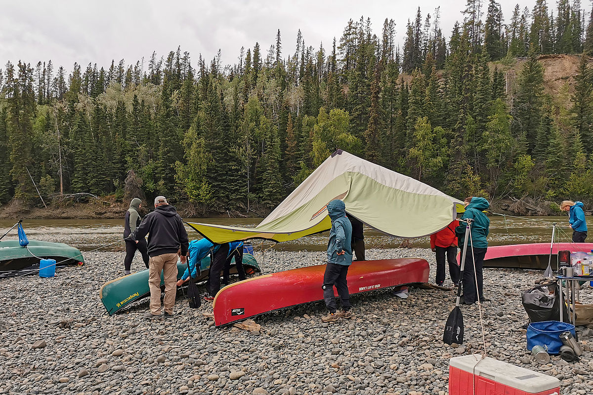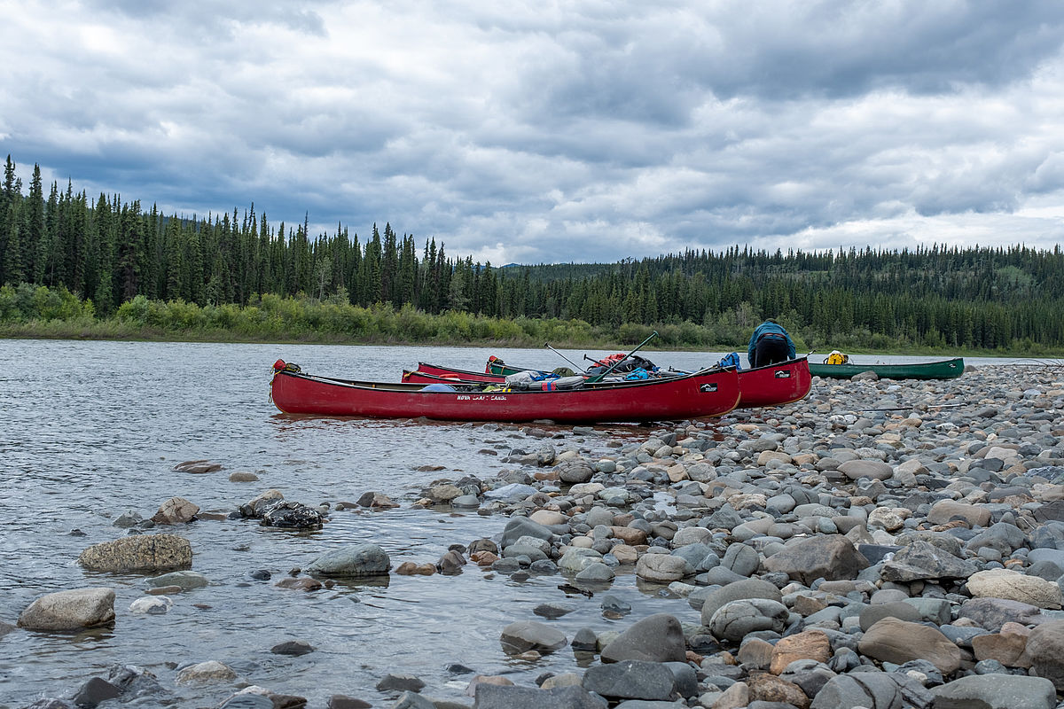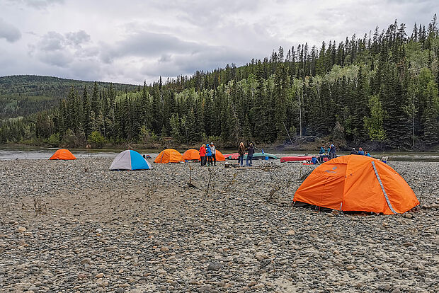 Dann wird es Zeit, ein Camp zu suchen. Wir halten an mehreren Stellen an. Ein Camp ist zu klein, ein anderes zu matschig. Das dritte, eine Insel mit Steinstrand, nehmen wir dann.