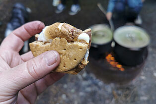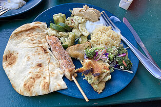 Auch das Dinner ist wieder Klasse. Es gibt Hähnchen, Reis, Salat, Zucchini mit Halloumi, gebackene Paprika und Pita-Brot. Zum Nachtisch grillen wir Marshmallows im Schoko-Keks-Sandwich.