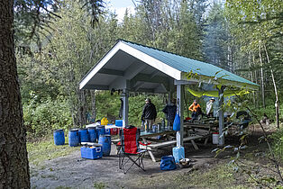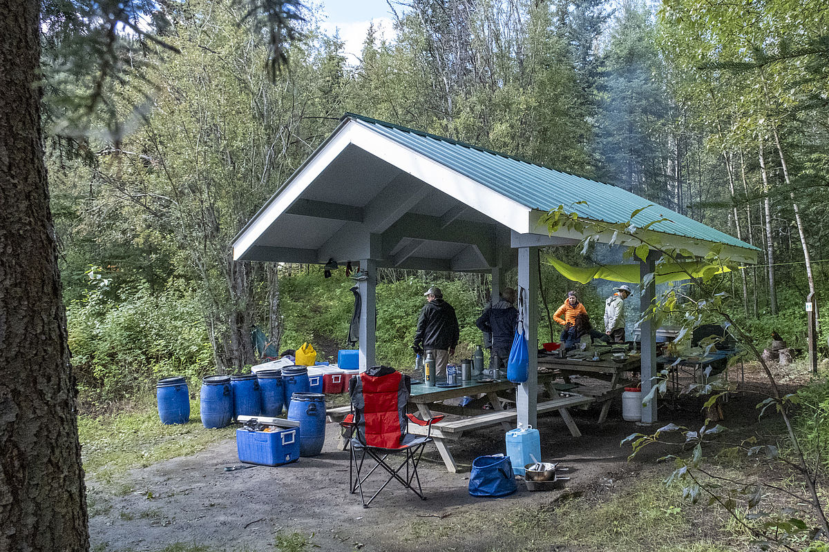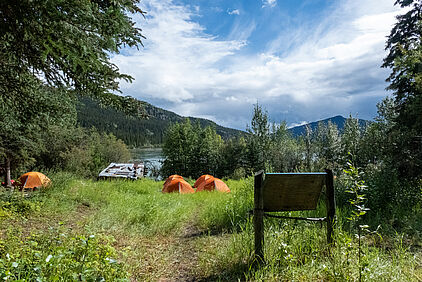 Das Camp ist prima. Es gibt saubere Plumpsklos, eine überdachte Sitzgruppe, mehrere Feuerstellen und viel Platz für die Zelte.