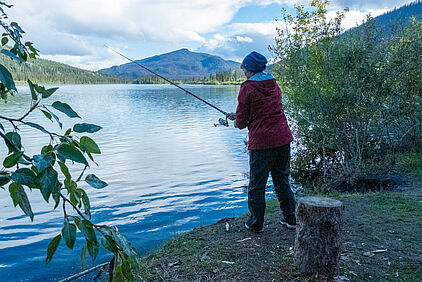 Als die Angel frei ist, schnappe ich sie mir und versuche es bis zum Schlafengehen. Ohne Erfolg. Besser, ich versuche es an einem anderen Ort noch einmal, denn hier und heute beißt kein Fisch an.
