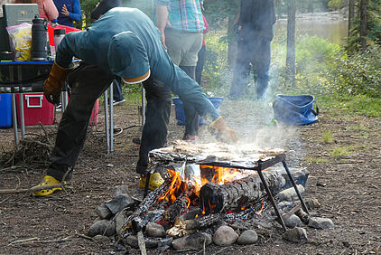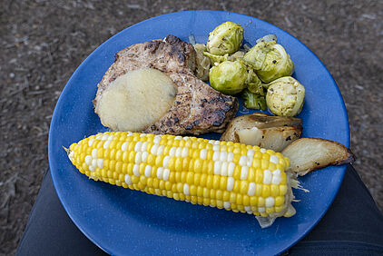 Dann treffen sich alle an der "Küche", halten ein Schwätzchen und machen Abendbrot. Es gibt Steaks mit Apfelmus, Rosenkohl, Zwiebeln, Backkartoffeln und Maiskolben, zum Nachtisch Pie.