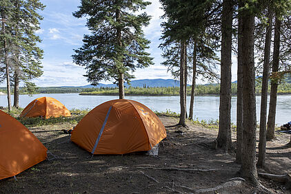 Wir bauen die Zelte auf. Man hat direkten Blick auf den Fluss. Durch den leichten Wind sind die Zelte jetzt im Nu trocken.