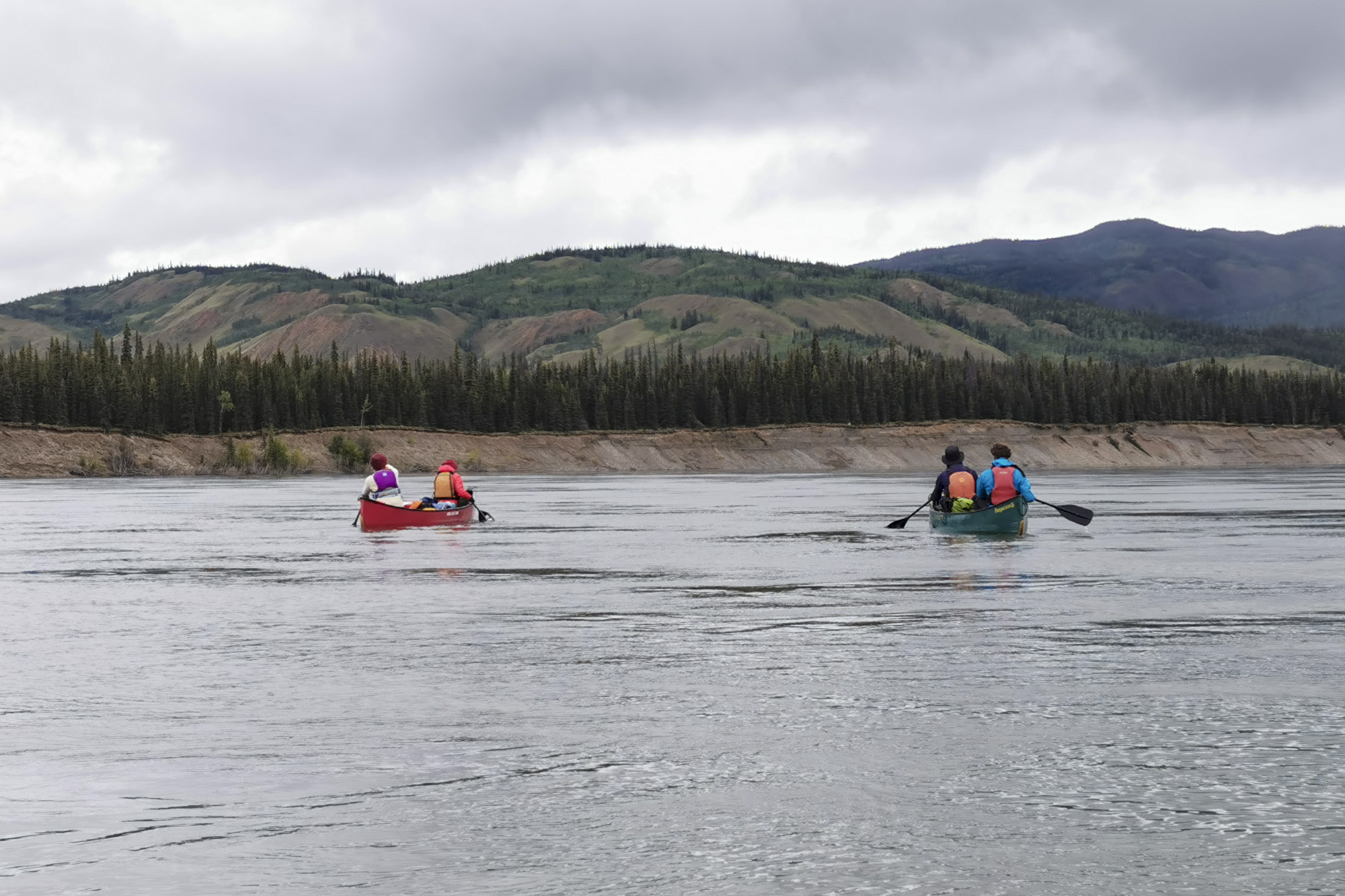 Inzwischen regnet es, und es ist windig. Ich hab heute Nacht meine Neoprensocken zum Trocknen am Zelt aufgehängt. Die sind nun ganz nass. Wir wollen schnell rudern, damit wir warm werden.