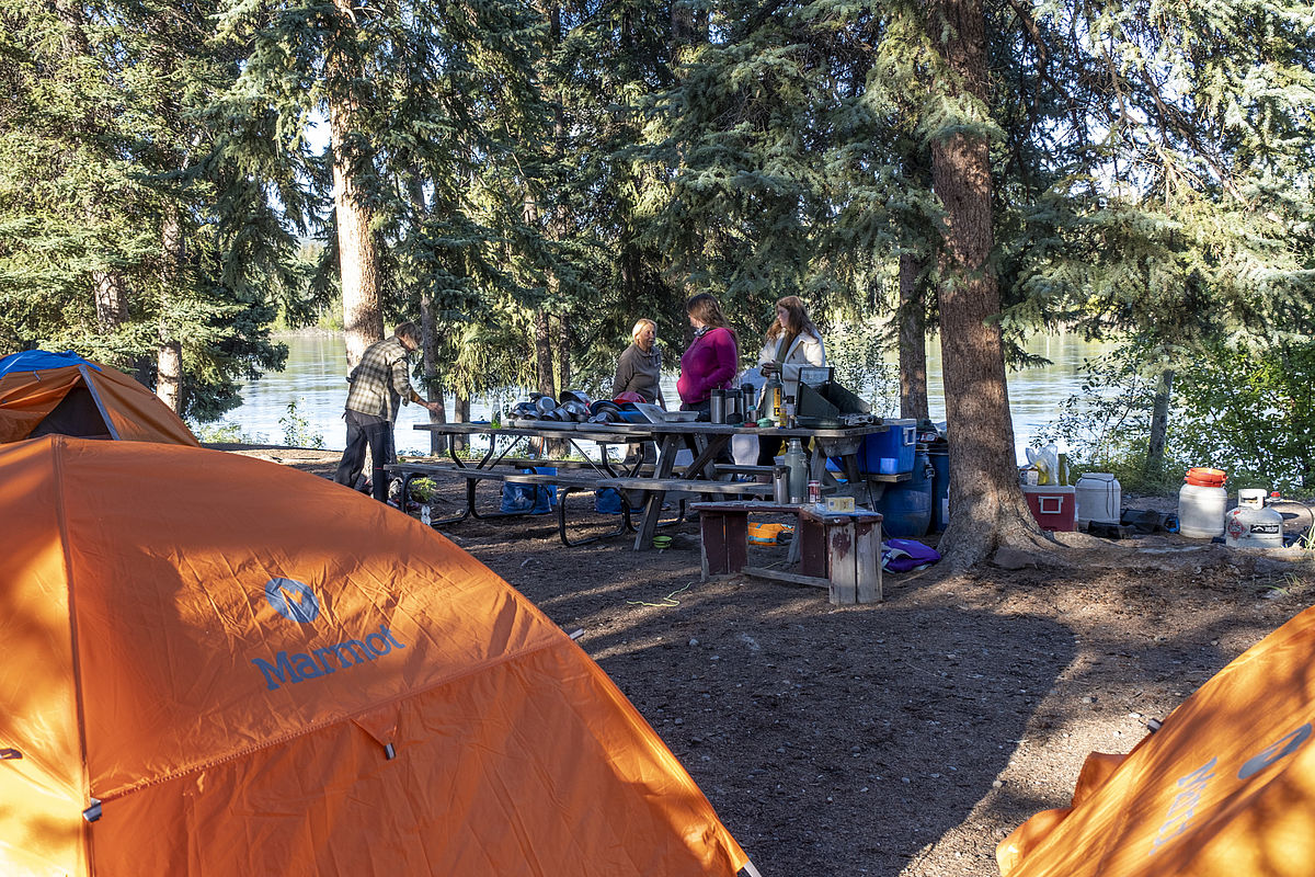 Wir bauen unsere Zelte auf. Dann nutzen wir aber erst einmal die Gelegenheit mit Teagan, die etwas einkaufen möchte, in die "Stadt" zu fahren. Denn hier wartet schon der Bus auf uns, der die Kanus morgen nach Whitehorse zurück bringen wird.