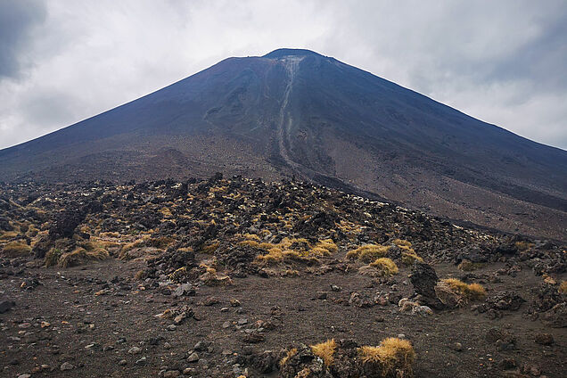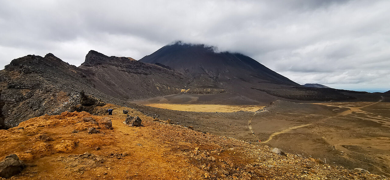 Der Abschnitt ab den Soda Springs bis zum Red Crater ist der beschwerlichste. Zum South Crater sind die 200 Höhenmeter besser bekannt als Devils Staircase, und die merkt man schon in den Beinen. Der Weg durch den South Crater geht durch flaches Gelände - ganz in gelb. Rechts türmt sich in fast schwarz der Mt. Ngauruhoe (2287m) auf, der seit "Herr der Ringe" auch als Mount Doom bekannt ist.