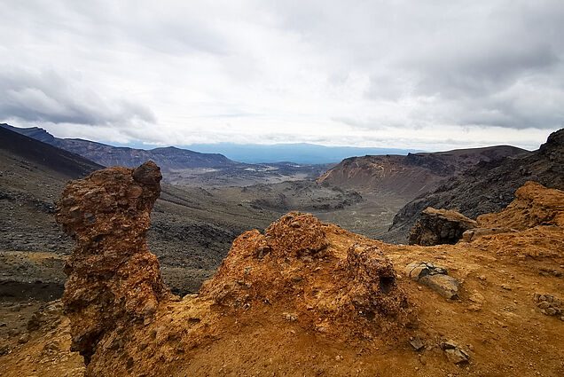 Die Wanderung beginnt mit einem einfachen Abschnitt auf Wegen und Holzstegen, die an längst erkalteten Lavafeldern vorbeiführen. Dann steht man bei den Soda-Springs am Fuß Tongariro Sattels.